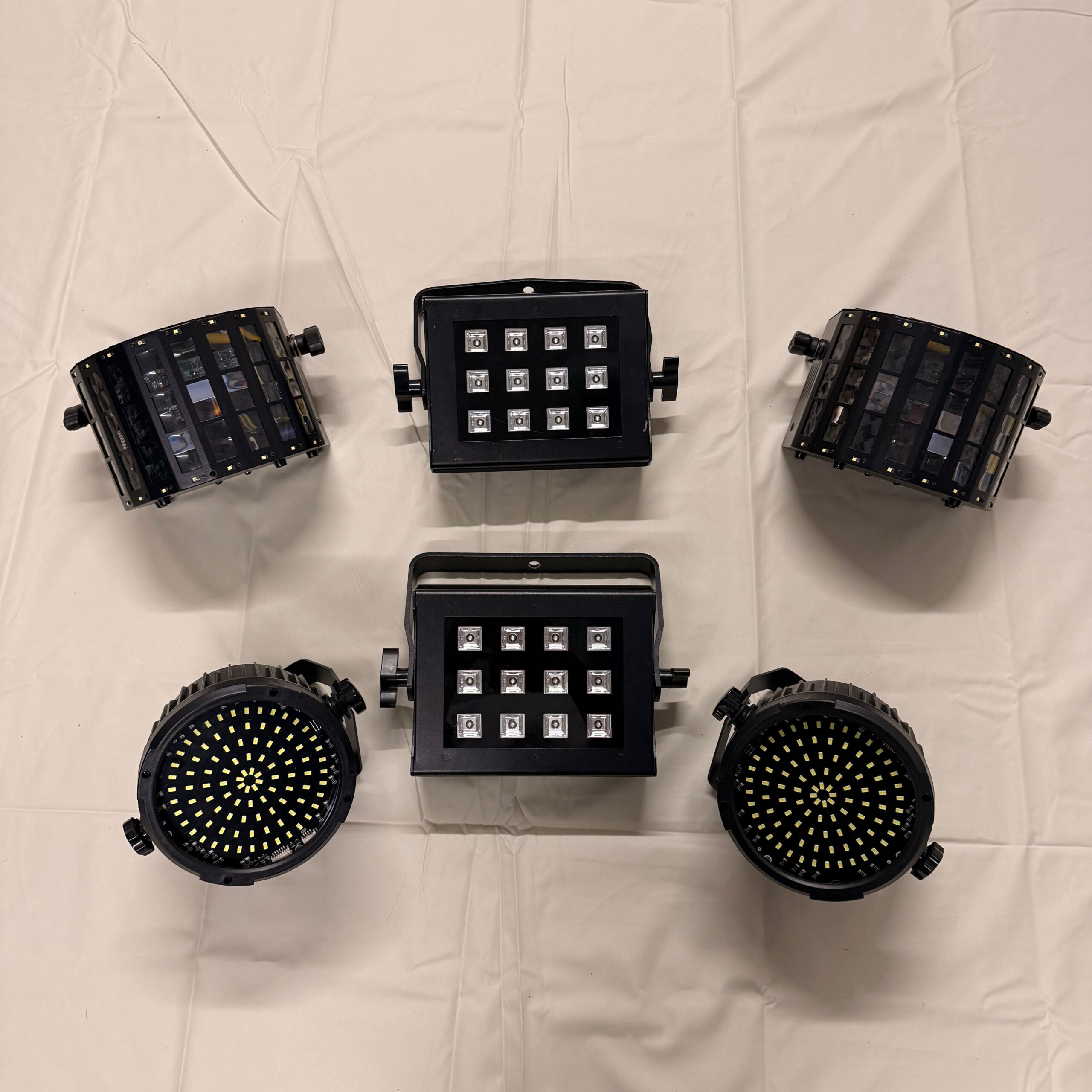 Die beiden Superflys werfen rotierende Beams über den Raum, während die SL-98 Strobes im Takt der Musik blitzen und die Szene zum Pulsieren bringen.