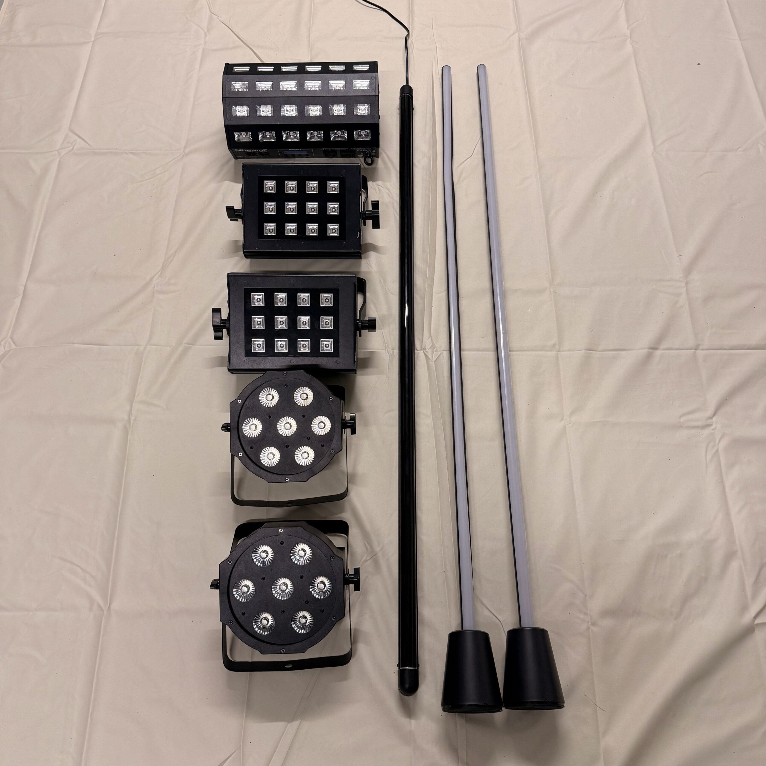 Zwei MaxiPars bringen warme Grundfarben, während zwei UV Floods, ein BUV-Fluter und eine UV-Röhre für intensives Schwarzlicht sorgen.
